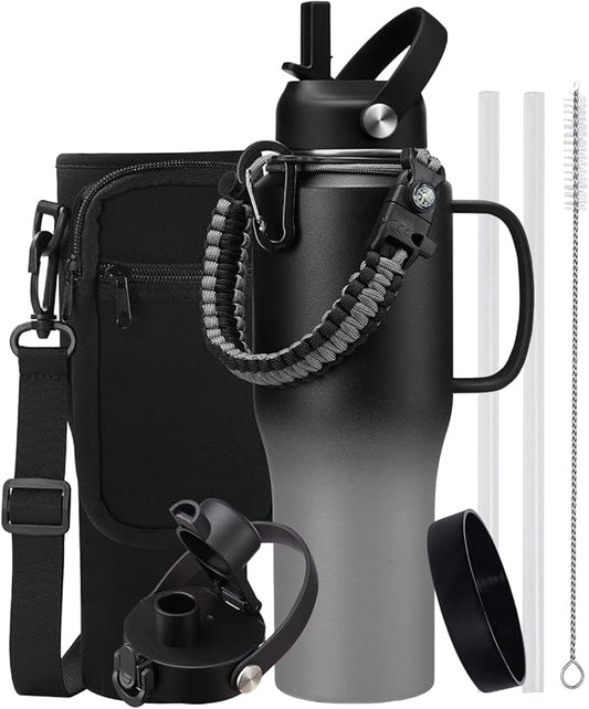Insulated Water Bottle 32 oz Tumbler with Handle and Straw - Stainless Steel Water Bottle That Fits in Cup Holder, Keep Cold 48h & Hot 24h, Double Wall Thermo Flask Coffee Tumbler Travel Mug