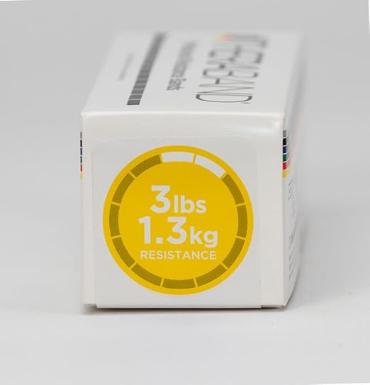 - Thin Yellow Bands are the 2nd of 8 resistance levels, perfect for rehabilitation or beginners. They offer 3.0 lbs. resistance at 100% elongation, a 25% increase from the previous color, and 4.3 lbs. at 200%. The roll measures 6 yards long x 5" wide