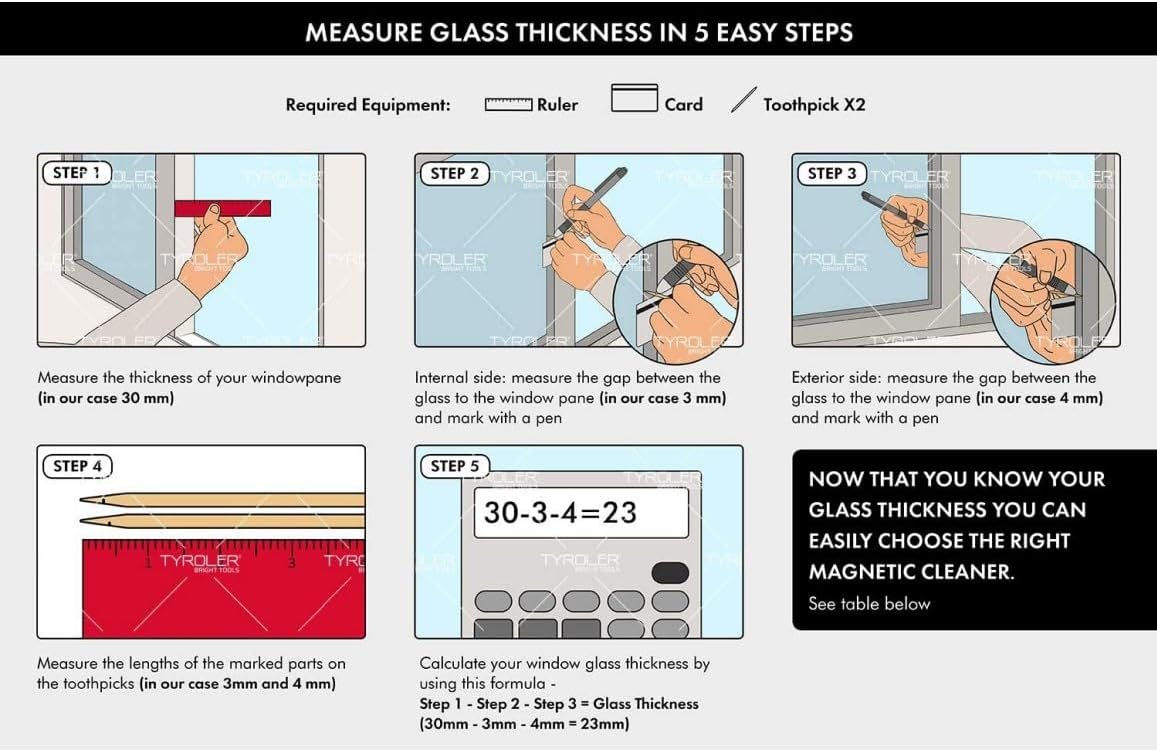 - IMPORTANT - Ensure you check the "measure your window guide" (second picture) before purchasing your magnetic window cleaner tool. Proper measurement ensures the optimal use of this window cleaner machine.