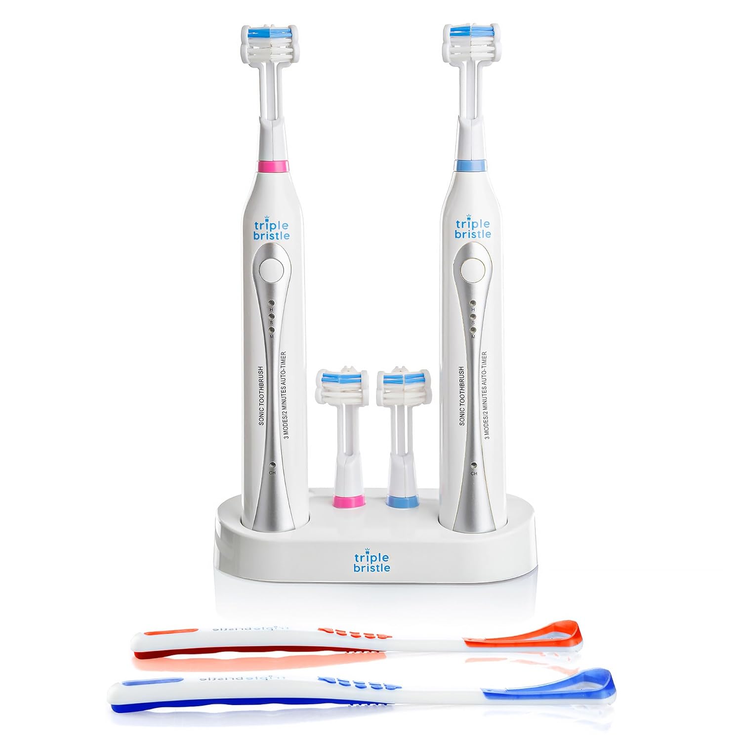 - RECHARGEABLE BATTERY - Keep your Triple Bristle toothbrush charged with the dual plug-in charging station! The 3 headed toothbrush handle is equipped with a charging indicator light that will help you keep your toothbrush charged.