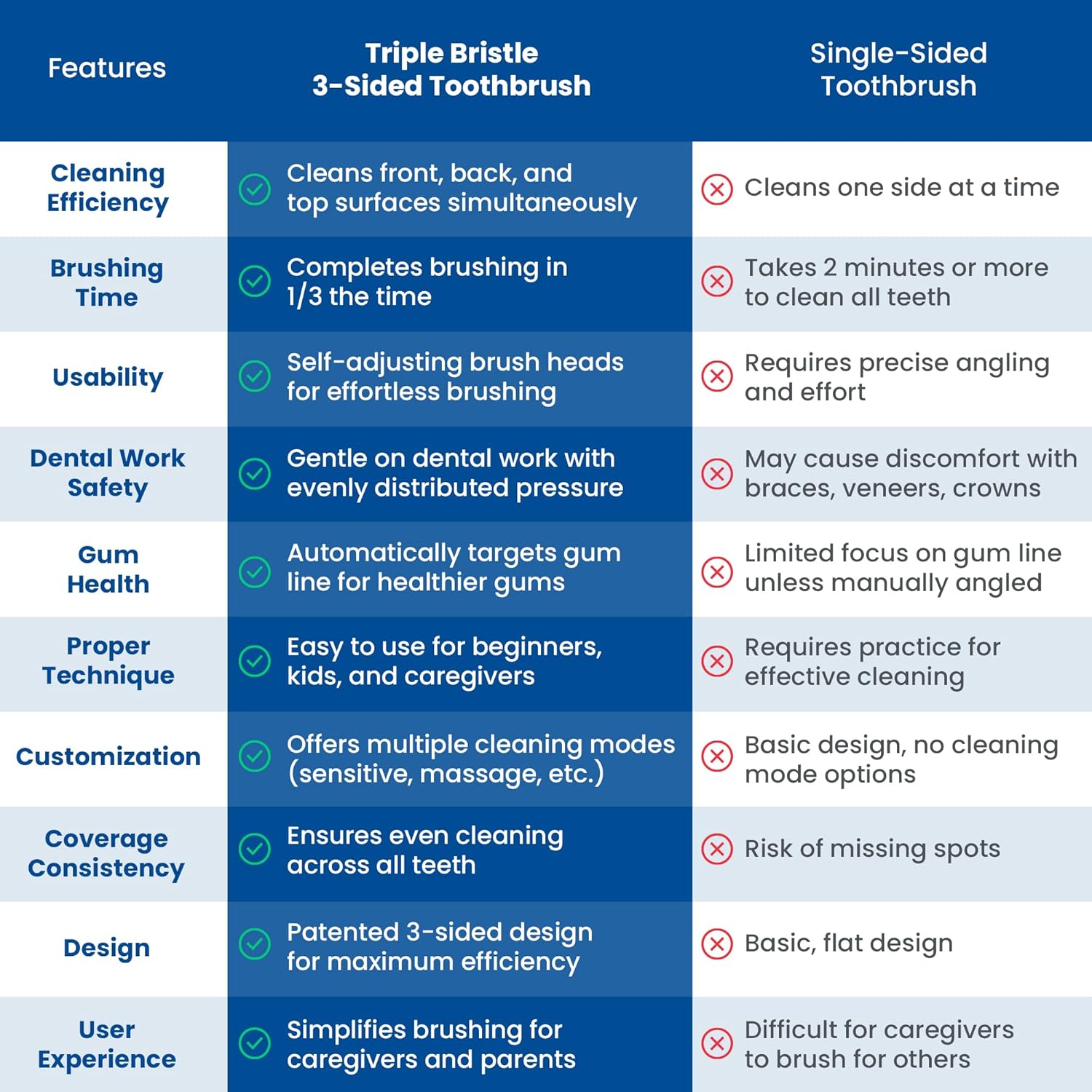 - A TOOTHBRUSH FOR EVERYONE - The slim easy-grip handle and quick yet effective brush head was made for EVERYONE! Maybe brushing has become harder due to arthritis or swollen hands, The Triple Bristle 3 Sided Toothbrush Adult design can speed up the process and make brushing more comfortable. Maybe youβre a caregiver and you need help providing the best oral care, Triple Bristle is the brush for you! Our toothbrush can even help autistic or special needs get proper brushing.