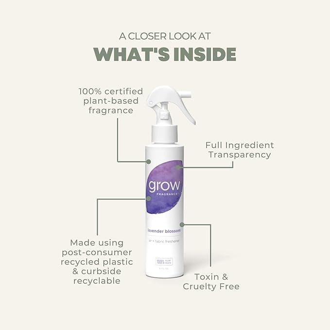 - Rejuvenate Your Space: Rely on the refreshing scent of all-natural essential oils, captured perfectly in Grow Fragrance Fabric and Room Air Freshener Sprays. Crafted with care by master perfumers, our spray is a certified non-toxic, 100% plant-based solution to traditional air fresheners.