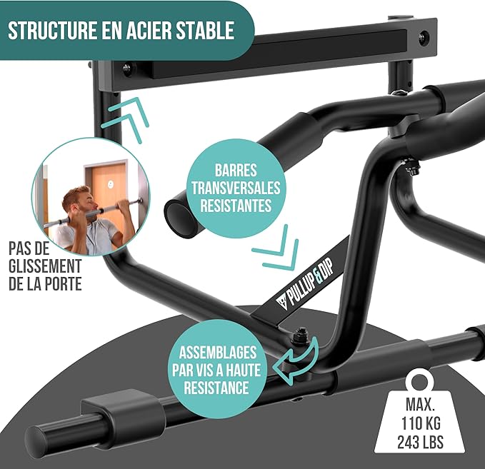 PULLUP & DIP Pull-up bar for door frames for hanging without screws and no slipping, professional door bar, pull-up bar with padded handles