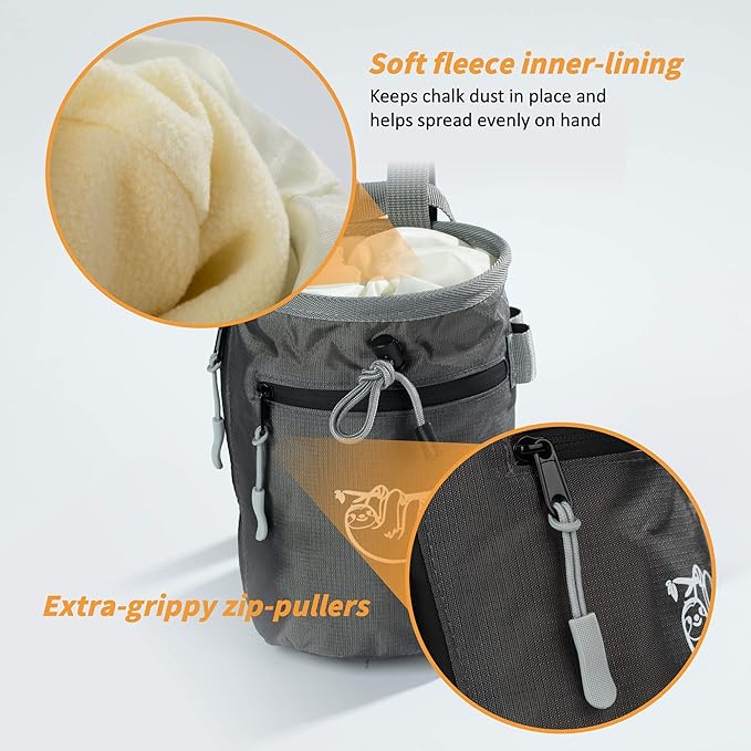- Anti-leak Design - Our no-leak design includes tight drawstrings to prevent chalk-spill. The bag is durable and waterproof to ensure your chalk stays dry. The inside is fleece-lined to keep your chalk dust in place and also helps to distribute the chalk evenly on your hands.