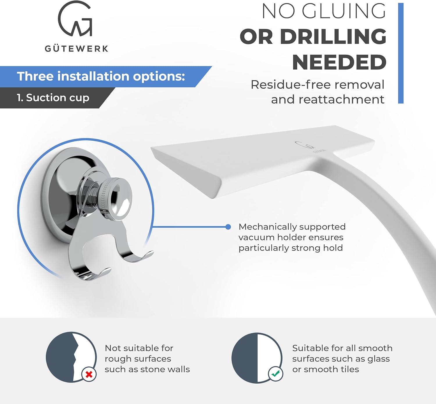 - MINIMALIST TIMELESS DESIGN - The GÜTEWERK glass squeegee is crafted with a matte white finish that impresses with its elegant timeless and smart design. In addition, the chrome-colored stainless-steel hook integrates well with any modern bathroom.