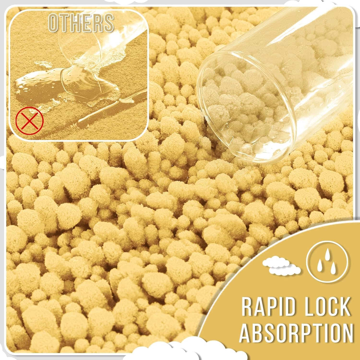 - Massive Water Absorption in Seconds: 5X faster than other materials mats, Yimobra bath mat absorbs 1000ml of water in 3 seconds. The vertical fiber channels lock moisture away from the surface, keeping your bathroom floor dry and discouraging damp environments. Perfect as a shower exit guard or sink splash catcher