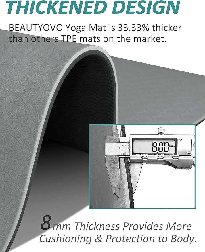 - β¨ PREMIUM ECO FRIENDLY TPE MATERIAL - The material of a mat will determine the texture, stickiness, sponginess, and eco-friendliness. Most yoga mats are made of either plastic or rubber. BEAUTYOVO eco friendly TPE yoga mat moisturizes the advantages of plastic and rubber in one, which features higher elasticity, better abrasion & tear resistance, and more eco-friendly than traditional PVC, NBR materials. It last a long time and can endure many yoga practice.