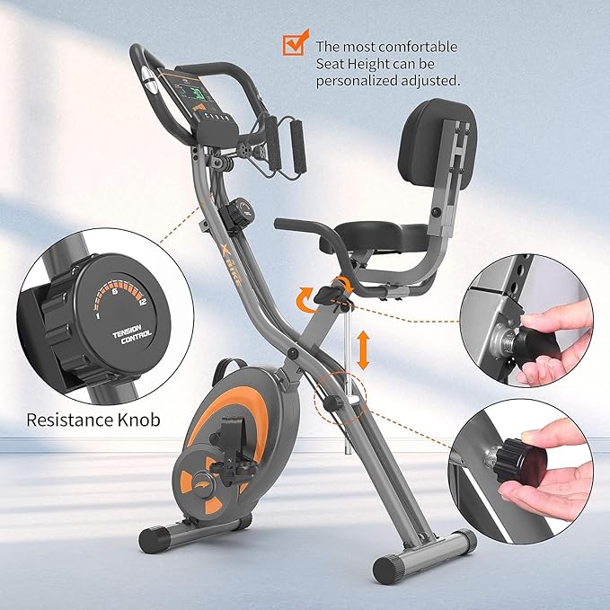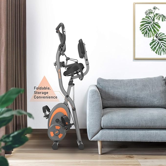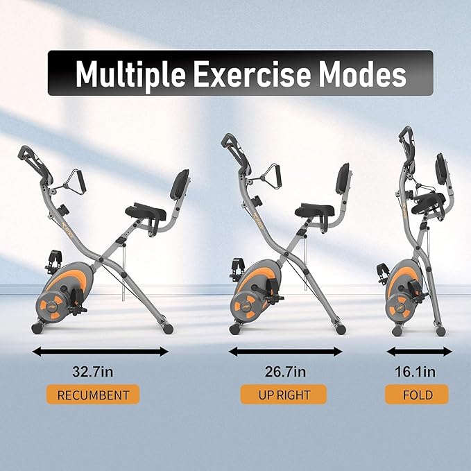 - 【FOLDABLE & ADJUSTABLE & EASY TO MOVE】The folding exercise bike can be easily folded fully (18.5*9.8*52.7 inches) to occupy minimal space for storage.The backrest is also folding design.And the height of seat can be adjusted with 7 levels which can fit for different users.The stationary bike equips with portable wheels,which allow you move the exercise bike easily at your home gym.