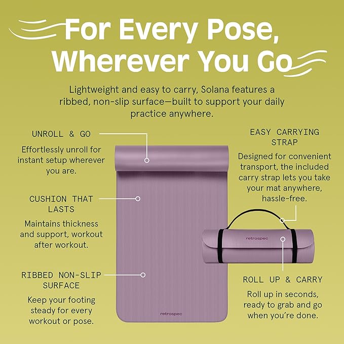 - EXTRA THICK FOR COMFORT & BALANCE: Solana firm 1-inch extra thick fitness mat w/ mat strap alleviates stress on pressure points such as joints, hips, hands, and knees. Solana measures 72" X 24" X 1".