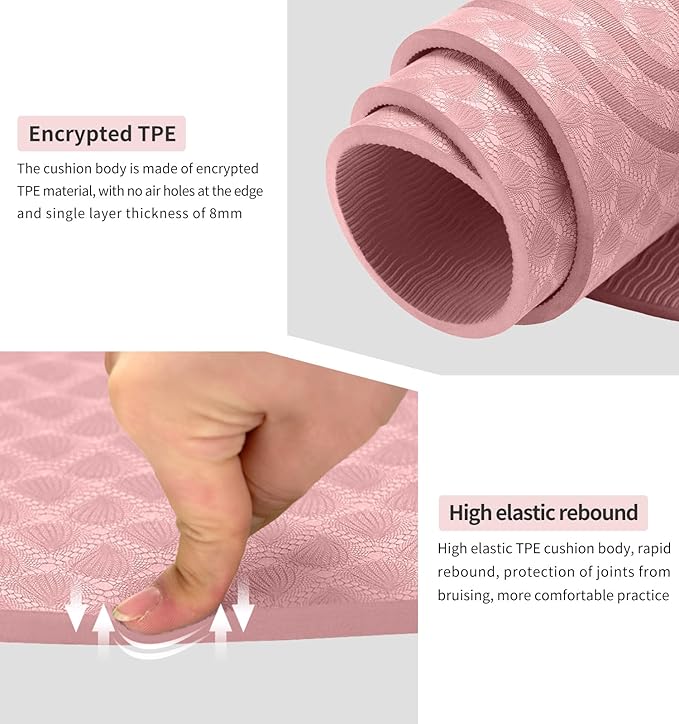 - ❤ THICK & SAFE: This 8mm thick exercise mat would alleviate stress on pressure points such as joints, hips, hands and knees.This durable and thick yoga mat with extra cushioning effect may well protect your joints during your yoga or fitness exercise.