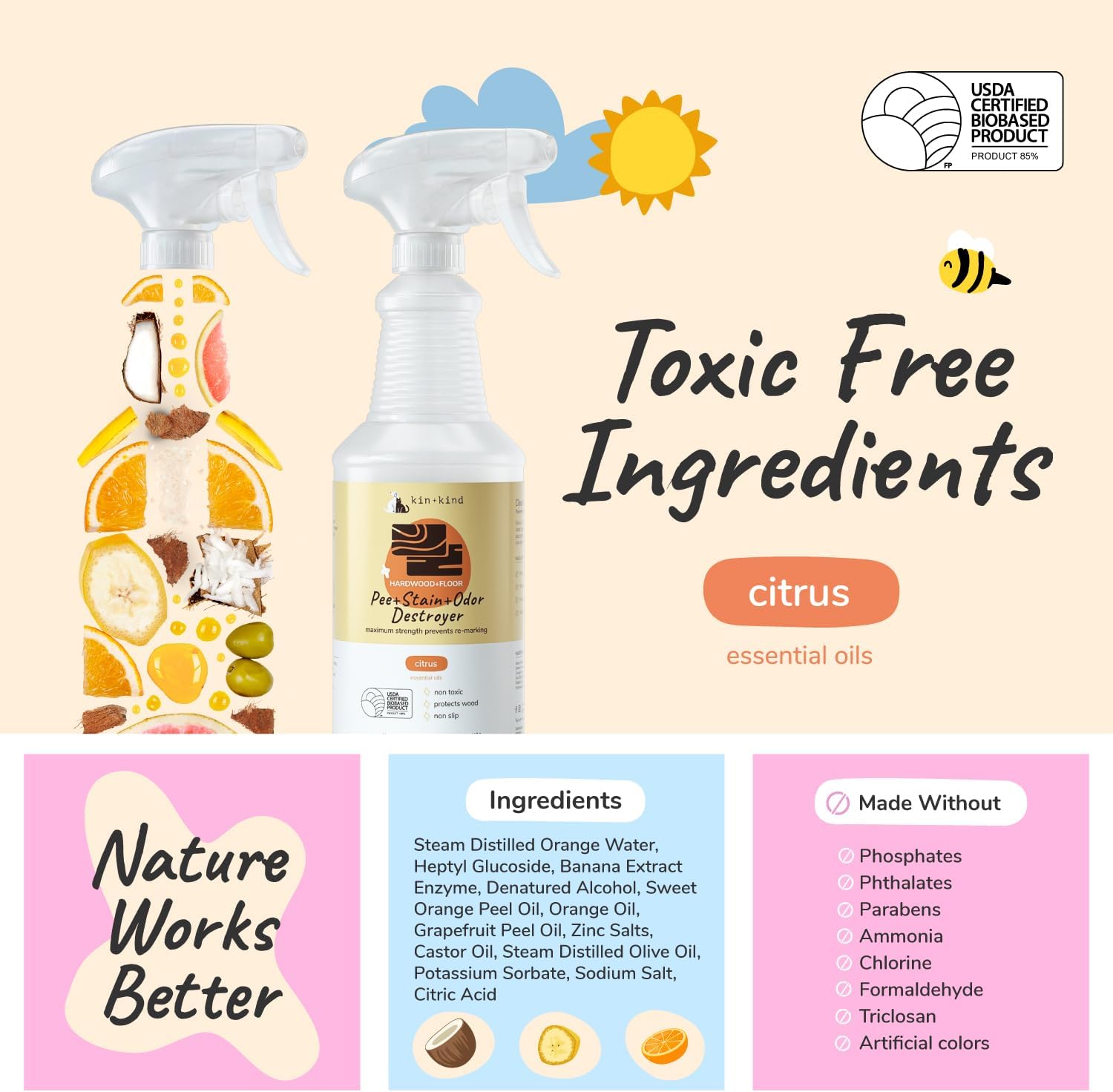 kin+kind Pet Odor Eliminator for Home - Litter Deodorizer, Pet Urine Odor Eliminator Spray and Stain Remover Spray for Harwood Floods, Carpet and Fabric - Pee, Odor and Stain Destroyer 32 fl oz