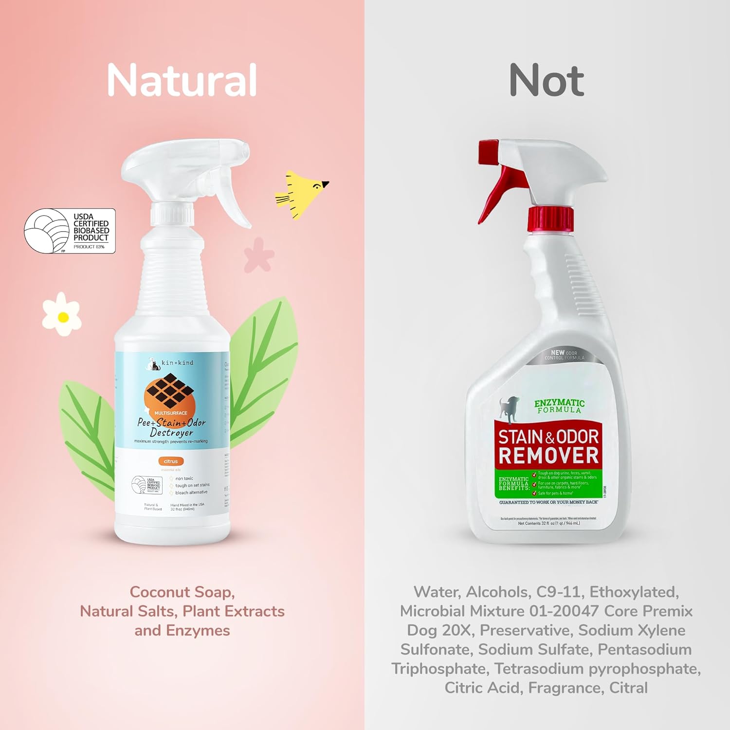 kin+kind Pet Odor Eliminator for Home - Litter Deodorizer, Pet Urine Odor Eliminator Spray and Stain Remover Spray for Harwood Floods, Carpet and Fabric - Pee, Odor and Stain Destroyer 32 fl oz