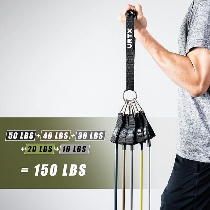 - 【Adjustable Resistance System】Includes 5 levels, 47-inch exercise bands: 10 LBS, 20LBS, 30 LBS, 40LBS and 50LBS. Combine or use individually for a customizable workout, reaching up to 150 lbs of resistance.