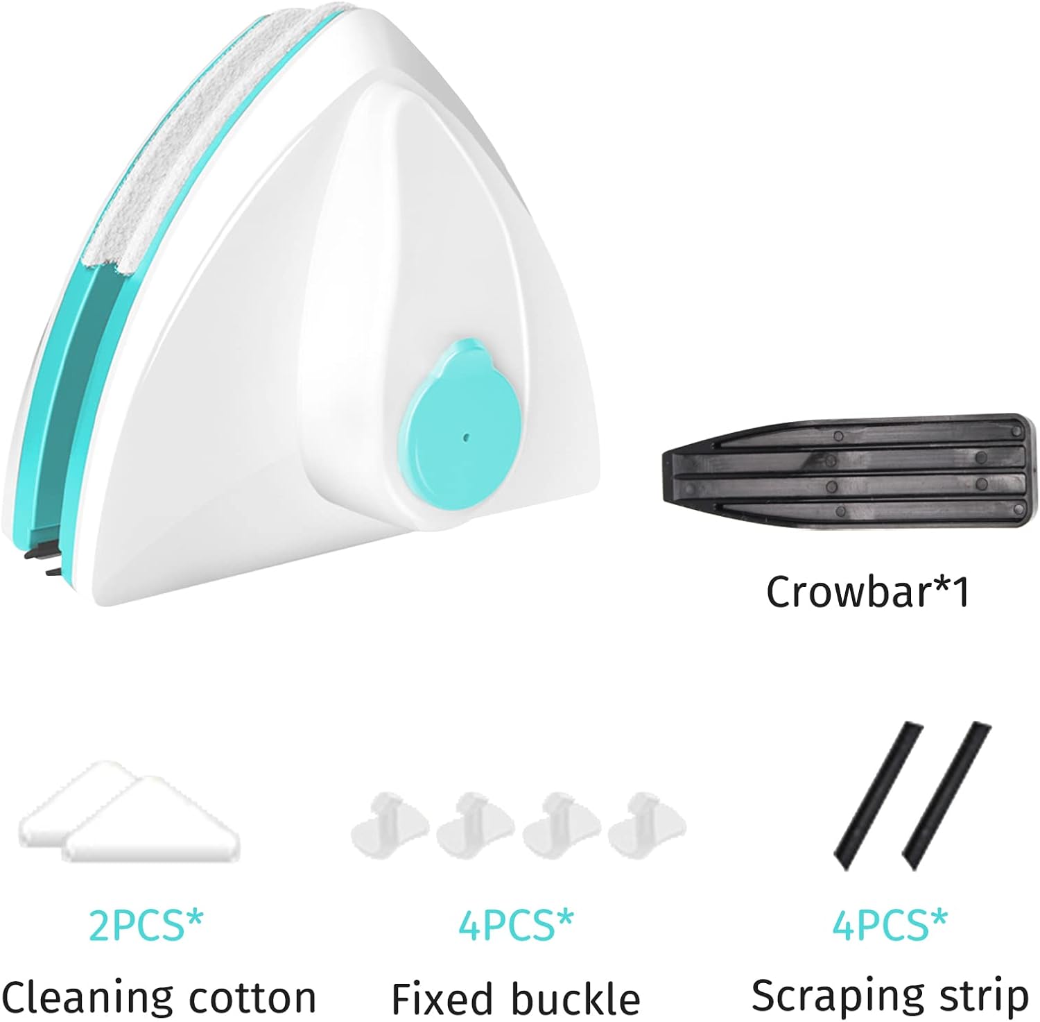 - 2, [Unique triangular unobstructed design]: The magnetic glass cleaner with triangular design can be wiped to narrow areas on the window, and the triangular frictional resistance is small, which saves effort to clean the window, and decontaminates without dead ends. Built-in magnetic block, scraper, cleaning sponge, water reservoir. Replaceable wiper strip, cleaning cotton and fixed button.