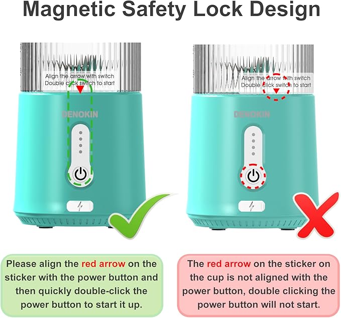 - 🍹【Simple & Safe Operation】This personal size blender has a magnetic induction switch that only works properly when the jar is connected to the two magnetic poles of the base. The single button operation makes this travel type smoothie blender quick and easy to use, just double click the power button to start, better to prevent accidental touch.