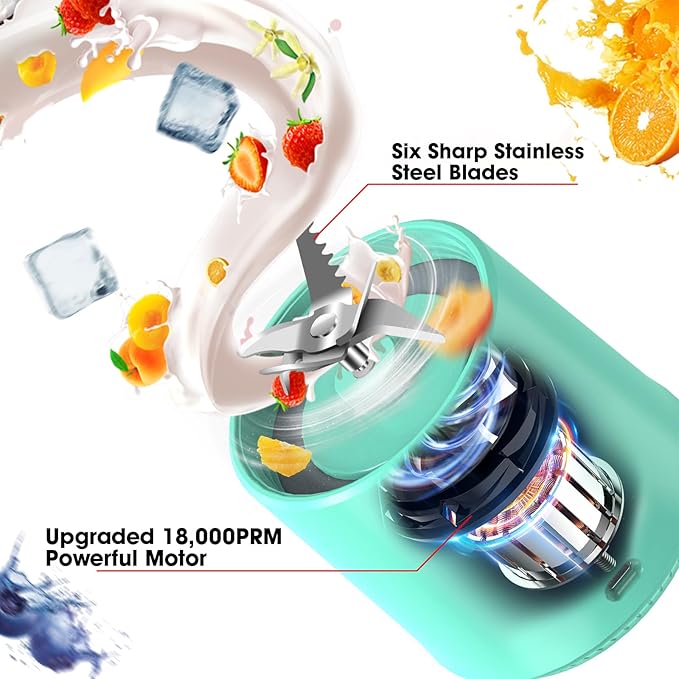 - 🍹【Powerful and effective】The mini blender is equipped with more powerful stronger 18000 RPM 7.4V motor, it only takes 30 seconds to get the juice or shake you want and be blended up. The durable stainless steel 6 blades can easily cut through ice and blend fruit.
