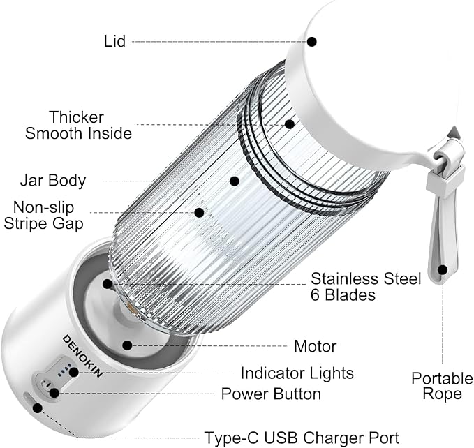 DENOKIN Portable Blender 16oz Vessel, Cordless Personal Size Small Blender for Shakes and Smoothies with 6 Blade for Kitchen, Home, Travel