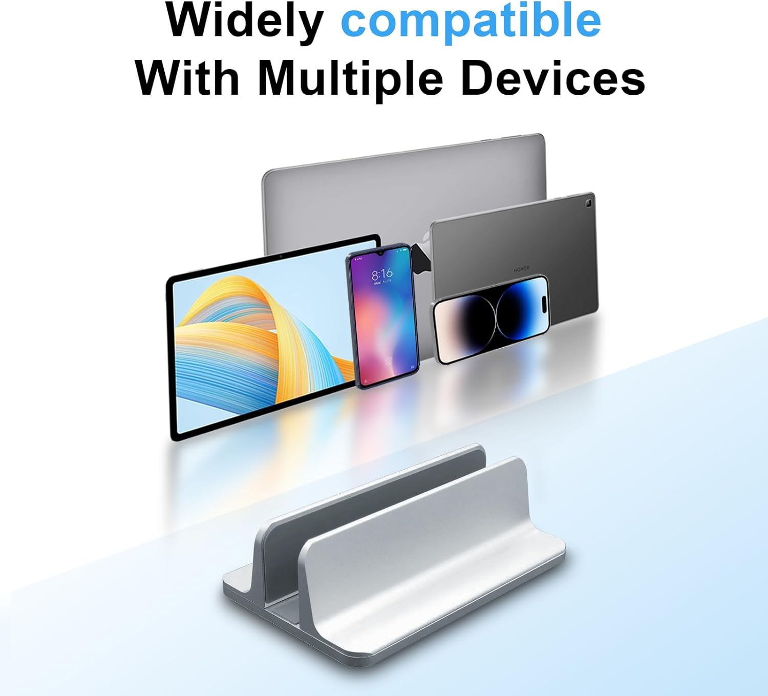 - Wide-Ranging Compatibility: This vertical laptop stand is compatible with a diverse range of devices, including Compatible with Apple MacBook Pro/Air, iPad, Microsoft Surface, Chromebook, Notebooks, Dell, Samsung, Acer, Sony Asus XPS, HP ENVY Series, and various phones.