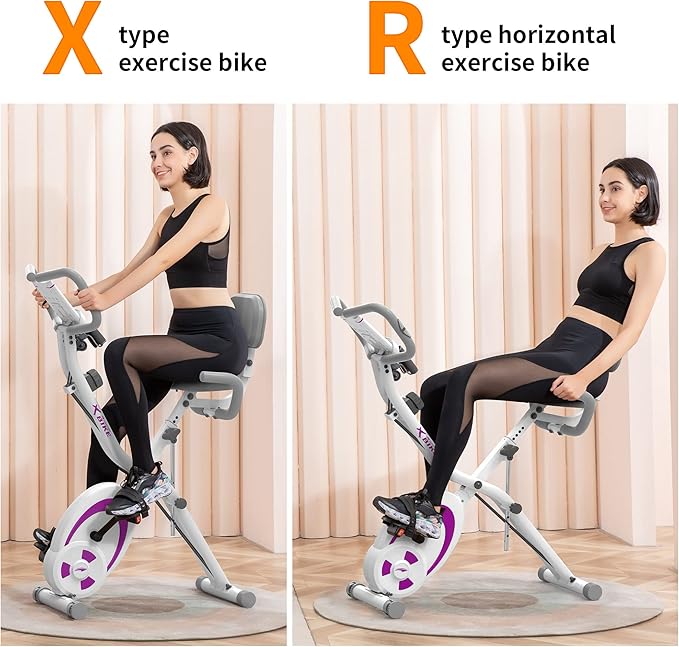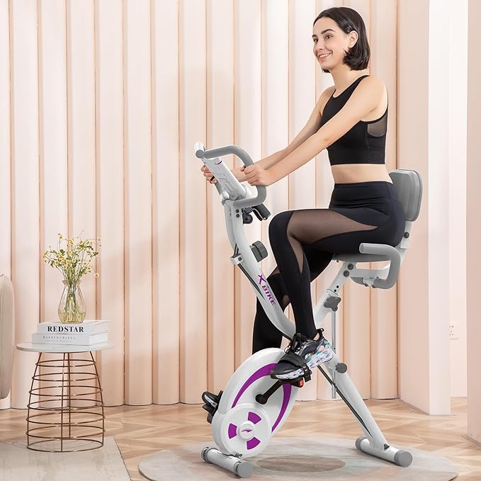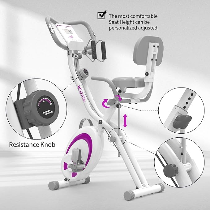 - 【FOLDABLE & ADJUSTABLE & EASY TO MOVE】The folding exercise bike can be easily folded fully (18.5*9.8*52.7 inches) to occupy minimal space for storage.The backrest is also folding design.And the height of seat can be adjusted with 7 levels which can fit for different users.The stationary bike equips with portable wheels,which allow you move the exercise bike easily at your home gym.