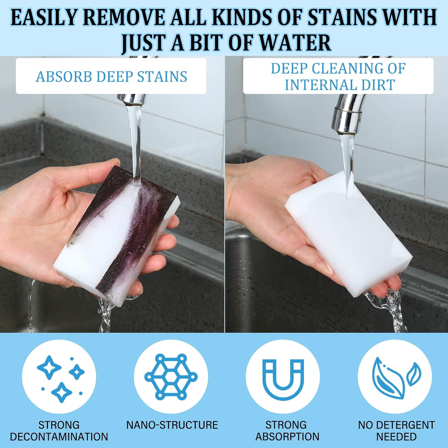 - Multiple Uses: the cleaning sponge is suitable for kitchen, ceramic cookware, glass, stove, coffee maker, wall, bathrooms, doors, floors, sinks and other places, which has nice decontamination ability