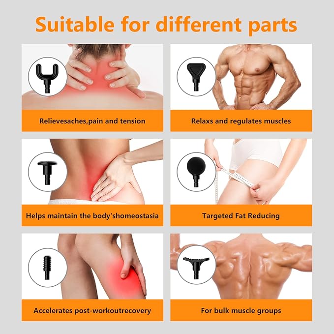 - Portable USB charging equipment, 6 kinds of professional massage heads to meet the needs of different muscle groups. The percussion massage gun will automatically stop after 10 minutes of continuous