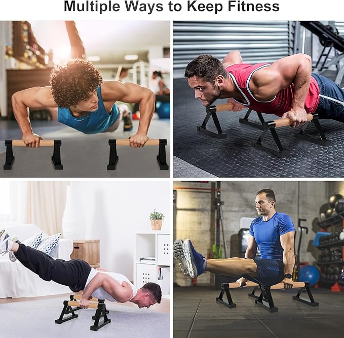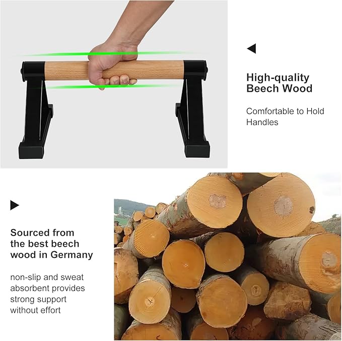- 💪 【Durable Solid Wood】 The wooden parallettes are made of high-quality solid wood, natural non-slip beech handles with strong metal brackets, sturdy and durable, they grip the hard floor surfce well so that there is absoloutely zero slipping.These paralettes are quite stable and have smooth handles, no edge or bump where the metal brackets attach to the wood.