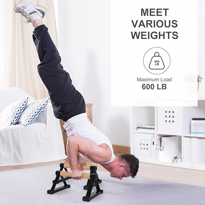 - 💪 【Great Grip and Non-slip Base】 The workout stands can support up to 600lbs (270kg), strong enough to target the triceps, biceps, lats, pecs, deltoids, abs, and more. Suit for L Sit, handstand training, handstand press,deep push-ups, manna training, elbow levers, planking, calisthenics, fitness etc. The paralettes bar calisthenics offers a comfortable grip, increases cushioning to reduce wrist fatigue and avoid injury during the workout.