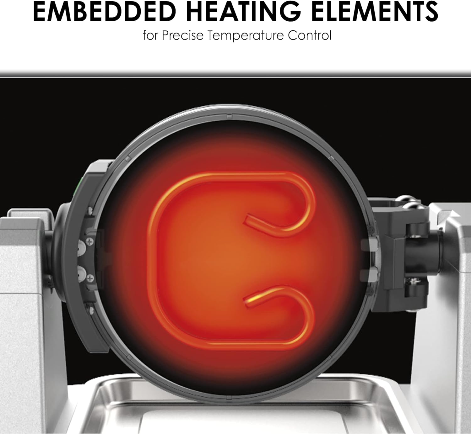 - Heating elements embedded into plates provide precise temperature control and even heat distribution, resulting in consistent golden-brown waffles
