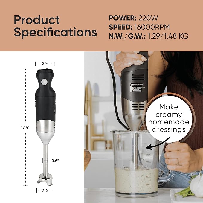 - Unwavering Reliability: With a robust 220-watt motor and a 1-year warranty, our immersion blender is a testament to its dependable performance and your peace of mind. This isn't just an appliance; it's a commitment to reliable performance and your utmost satisfaction.