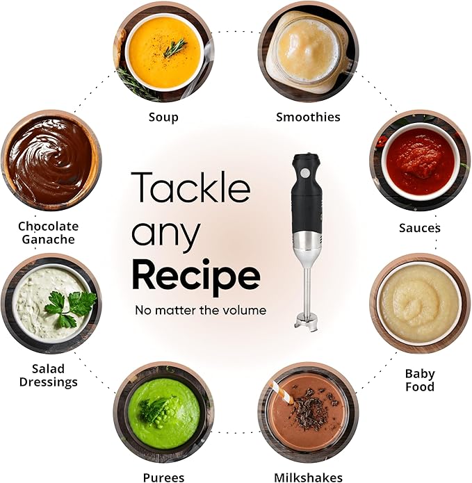 - Unleash Culinary Creativity: Whether it's silky-smooth soups, velvety sauces, or exquisite emulsions, our immersion blender effortlessly handles a range of foods, transforming ordinary ingredients into extraordinary culinary creations.