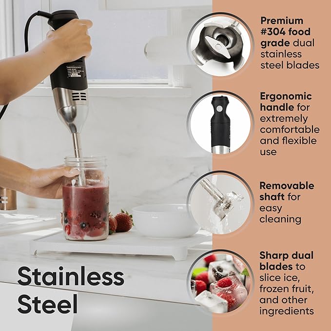 Handheld Immersion Blender 220W - 7” Stainless Steel with 8 Speeds - 110V + 1-Yr Coverage and 24/7 Pro Chef Support