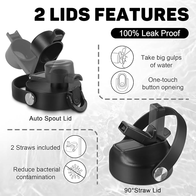- 【2 LEAK-PROOF LIDS】ABOTOCUP insulated water bottle provide a different drinking experience with two lids that are fully leak-proof and designed for effortless drinking. Easy to use one-handed or hands-free drinking even when you're busy. Perfect for all indoor and outdoor activities.
