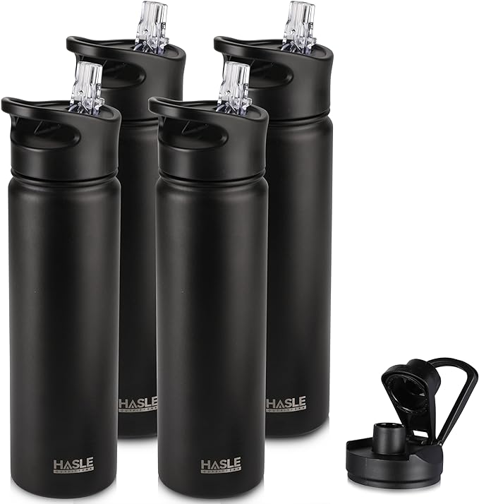 HASLE OUTFITTERS Insulated Water Bottle 22 oz Double Wall Stainless Steel Water Bottle Wide Mouth with Straw Lid & Spout Lid Keeps Cold or Hot(Black,4)
