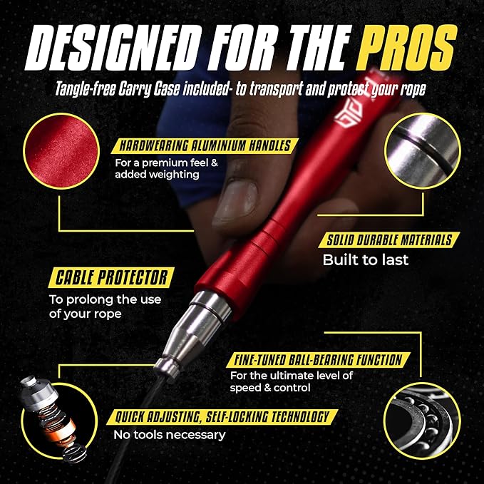 - PREMIUM QUALITY & DESIGN – We’ve used the highest quality components to make our jump rope. Using ergonomically designed aluminium handles for durability and weight, two cable thicknesses for alternative levels of skipping, cable protectors to prolong the life and a tangle-free carry case.