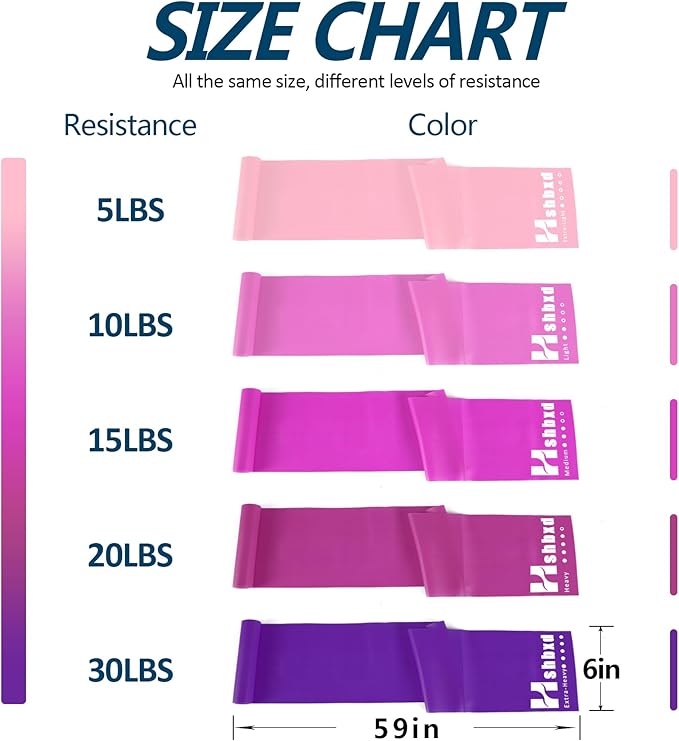 - 5 Levels Of Resistance - 5 resistance bands are 59in (150cm) long and 5.9in (15cm) wide, the resistance bands is yellow band (5 lbs), red band (10 lbs), green band (15 lbs), blue strap (20 lbs), gray strap (30 lbs).