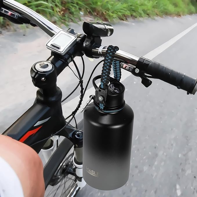 - 【FULL-FUNCTION PARACORD】This insulated water bottle comes with a beautiful hand knit nylon paracord. With compass, carabiner, flint fire starter and whistle. Three-finger wide handle can balance the gravity of the water bottle during walking, and you will not feel pain in your fingers. A carabiner enables you to carry it with ease or attach it to a backpack.