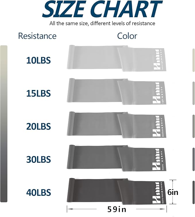 - Upgrade - Resistance band with handles, comes with door anchors and simple instructions. 5 Levels of Resistance, 5 resistance bands are 59in (150cm) long and 5.9in (15cm) wide, the 5 color resistance bands is yellow band (5 lbs), red band (10 lbs), green band (15 lbs), blue strap (20 lbs), gray strap (30 lbs). Additionally, the darker the gray and pink resistance bands, the heavier the resistance.