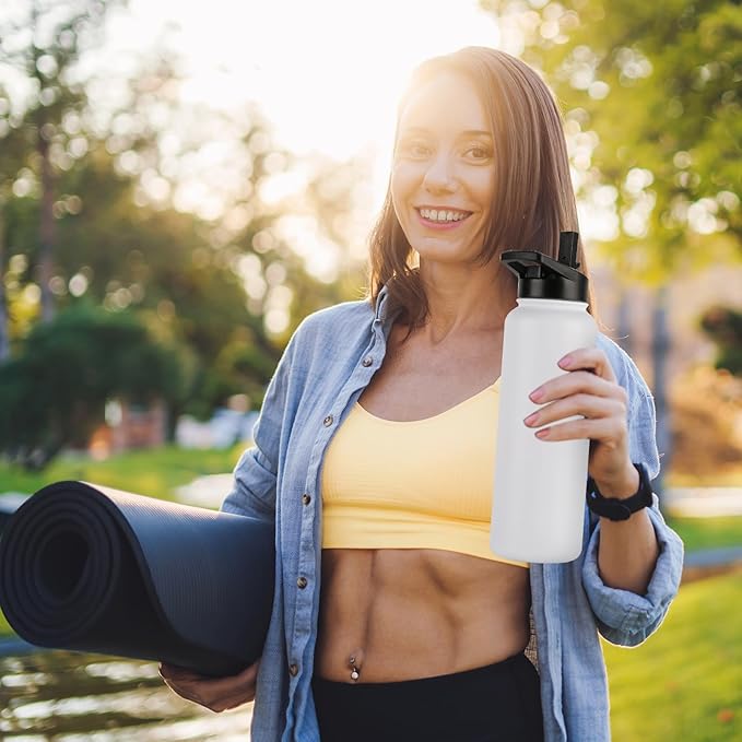 DOMICARE 40 oz Insulated Water Bottle, Vacuum Insulated Stainless Steel Sports Water Bottle with Straw Lid & Spout Lid, Leakproof, Reusable - Travel, Camping, Bike, White