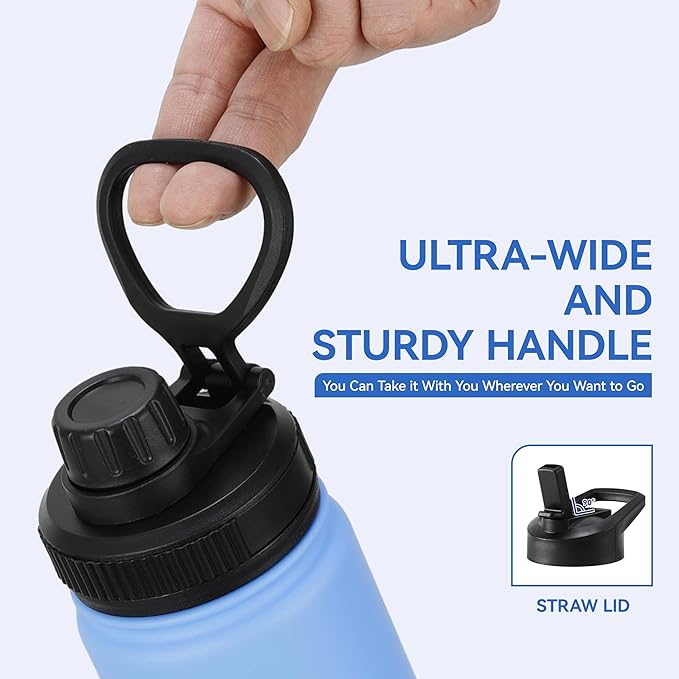 - Leak Proof: Two kinds of lids: Spout lid and flip lid, both of which can effectively prevent leaks. And the wide handle of the spout lid allows you to hold three fingers, reducing the pressure on your fingers when walking