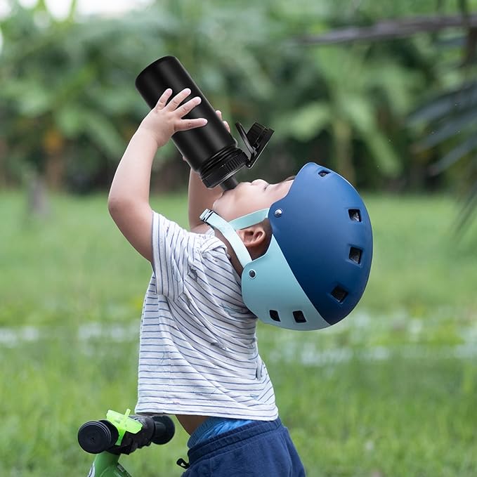 DOMICARE 16 oz Kids Water Bottle for School Stainless Steel Double Wall Vacuum Insulated Water Bottle with Straw lids & Spout Lid, Leakproof BPA Free (Black,4)