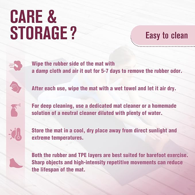 - CARE INSTRUCTION - 1. All natural rubber possesses a harmless rubber aroma. Wipe the rubber side with a damp cloth and place it in a well-ventilated area for 5-7 days, allowing the scent to gradually fade. 2. Store the yoga mat in a cool, dry place away from direct sunlight and extreme temperatures.