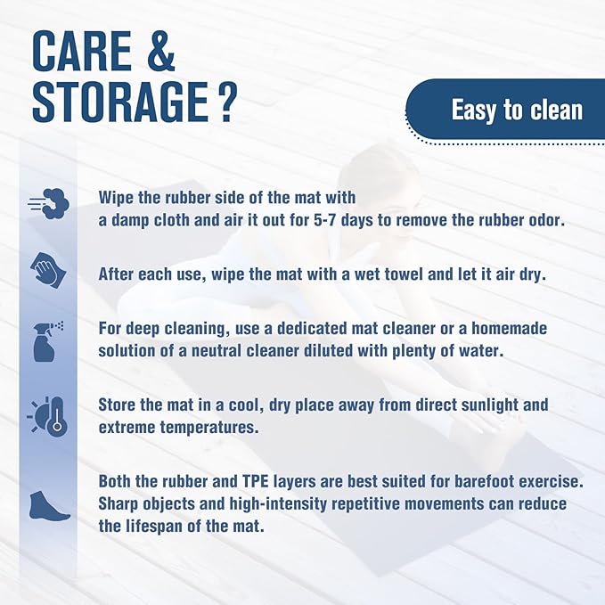 - CARE INSTRUCTION - 1. All natural rubber possesses a harmless rubber aroma. Wipe the rubber side with a damp cloth and place it in a well-ventilated area for 5-7 days, allowing the scent to gradually fade. 2. Store the yoga mat in a cool, dry place away from direct sunlight and extreme temperatures.