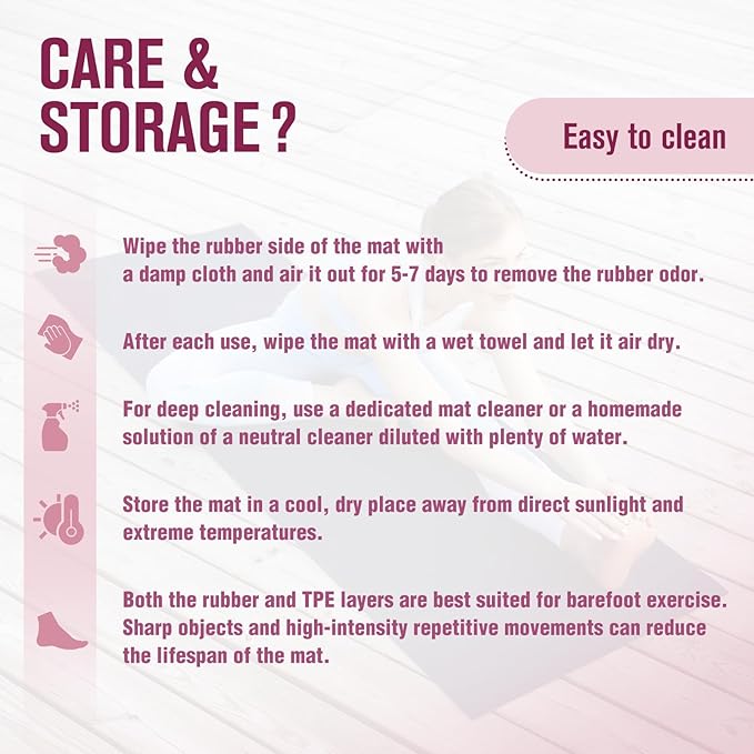 - CARE INSTRUCTION - 1. All natural rubber possesses a harmless rubber aroma. Wipe the rubber side with a damp cloth and place it in a well-ventilated area for 5-7 days, allowing the scent to gradually fade. 2. Store the yoga mat in a cool, dry place away from direct sunlight and extreme temperatures.