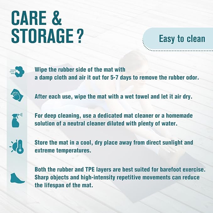 - CARE INSTRUCTION - 1. All natural rubber possesses a harmless rubber aroma. Wipe the rubber side with a damp cloth and place it in a well-ventilated area for 5-7 days, allowing the scent to gradually fade. 2. Store the yoga mat in a cool, dry place away from direct sunlight and extreme temperatures.