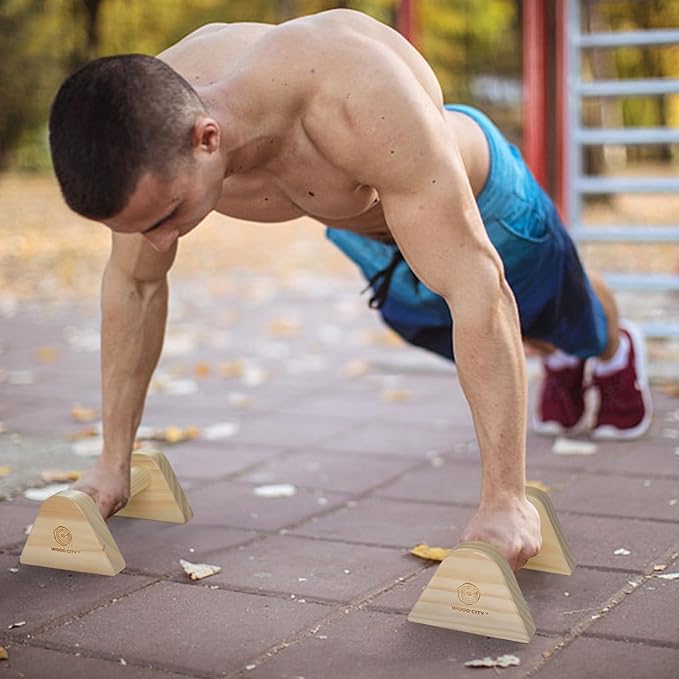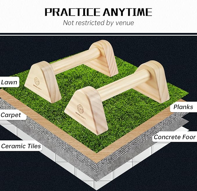 - ⭕CALISTHENICS BARS DESIGN FEATURES: Hand-crafted solid beech wood perfect bar that offers great wrist support with a natural feel on the joints to make you feel safe and boost your confidence. The ergonomic grip will help distribute weight evenly, reducing pressure points and joint strain on wrists and elbows (neutral position). The wooden push-up bars inspired by Olympic gymnastics parallel bars, absorb the sweat so you can maintain a solid grip.