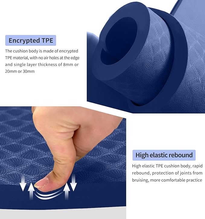 - ❤ THICK & SAFE: This 30mm thick exercise mat would alleviate stress on pressure points such as joints, hips, hands and knees.This durable and thick yoga mat with extra cushioning effect may well protect your joints during your yoga or fitness exercise.