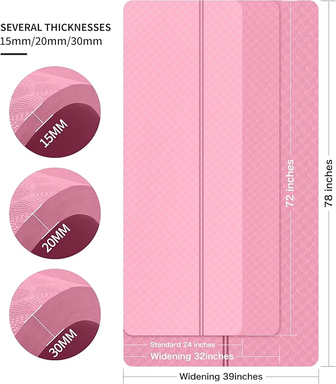 - 🌹EXTRA LONG EXTRA WIDE: nuveti's 72"x32"/78"x36" offers adequate space to fit any type of exercise like yoga, pilates, bikram, and fitness exercise.Most yoga mats on the market are 6mm, 8mm or even thinner. This yoga mat is thickened to 15mm,20mm,30mm which can provide more support and protection for your ankle, knees, joints, and body on hard floors, as well as absorbs vibration and reduces noise.