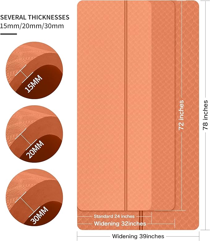 - 🌹EXTRA LONG EXTRA WIDE: nuveti's 72"x32"/78"x36" offers adequate space to fit any type of exercise like yoga, pilates, bikram, and fitness exercise.Most yoga mats on the market are 6mm, 8mm or even thinner. This yoga mat is thickened to 15mm,20mm,30mm which can provide more support and protection for your ankle, knees, joints, and body on hard floors, as well as absorbs vibration and reduces noise.