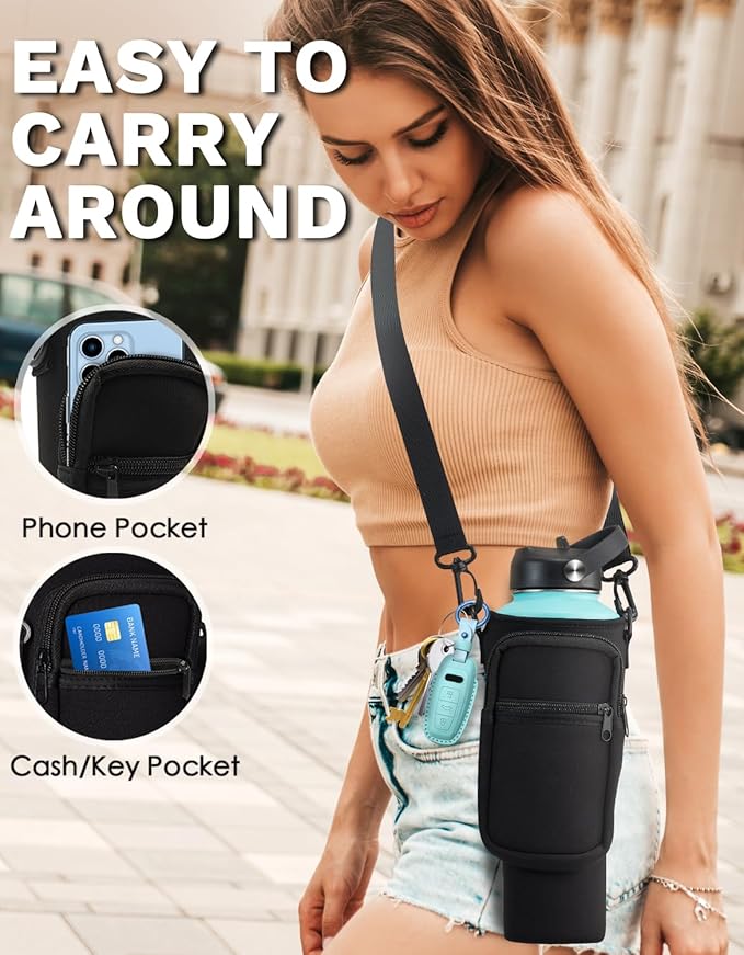 - STORAGE BOTTLE HOLDER & FLASK BOOT: The metal car water bottle carrier with 2 zippered pockets to holds your cards, keys or cash. Silicone water bottle boot provide extra protect for your 40 oz water bottle with straw