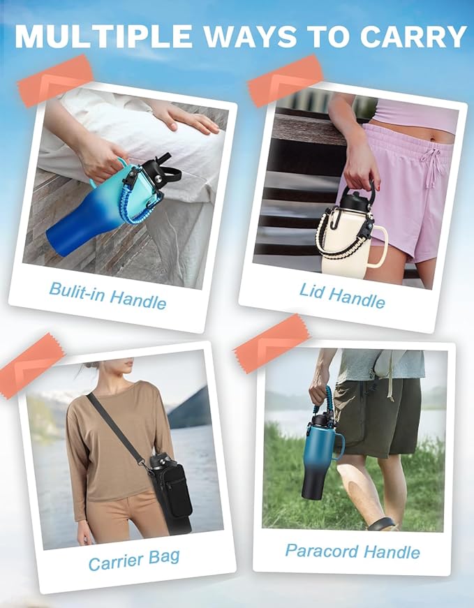 - INSULATED TUMBLER PACKAGE INCLUDE: 40 oz stainless steel water bottle with handle, and 8 bottle accessories (1 x auto spout lid, 1 x straw lid, 1 x bottle carrier bag with strap, 1 x paracord handle, 1 x protective boot, 2 x straws, 1 x straw brush), make this insulated cup your best travel companion